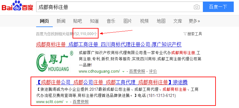 上图可以看出“成都工商注册”的相关结果是973万,说明在搜索引擎所抓取的全球所有站点网页里面,有973万的网页集合存在着“成都工商注册”这个词的出现,而“成都商标注册”出现的结果211万。通过这组数据可以看出“成都工商注册”明显要比"成都商标注册"优化难度要大,因为一个词是从973万的文档集合里面去把排名优化到100名以内,而另外一个词只需要211万。